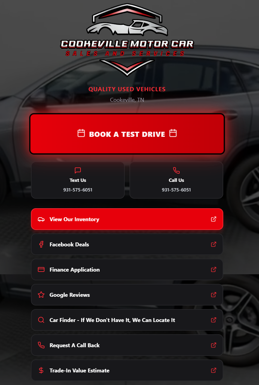 Branded with your logo and colors. Buttons for inventory, financing, reviews, directions, test-drive booking, and more - all in one shareable link.